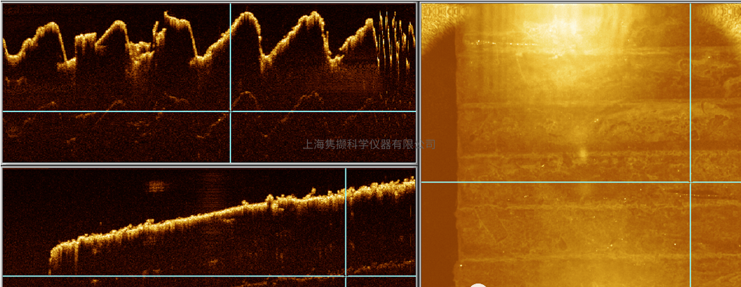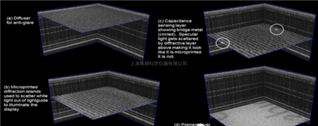 此处图7所示的基于 OCT 的 3D 测量适用于电子墨水显示器 ,可以清楚地看到层厚度、附着力和潜在缺陷。