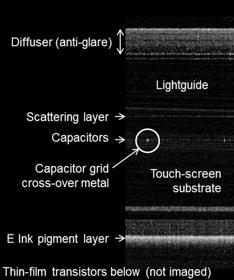 图6:2D OCT展现了平板显示器的结构,从上到下依次是——防眩光扩散器、光导、散射层、电容器(包括电容器网格交叉金属)、触摸屏基板、电子墨水颜料层和薄膜晶体管(未显示在图像中)。